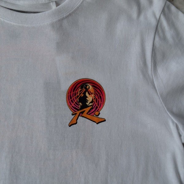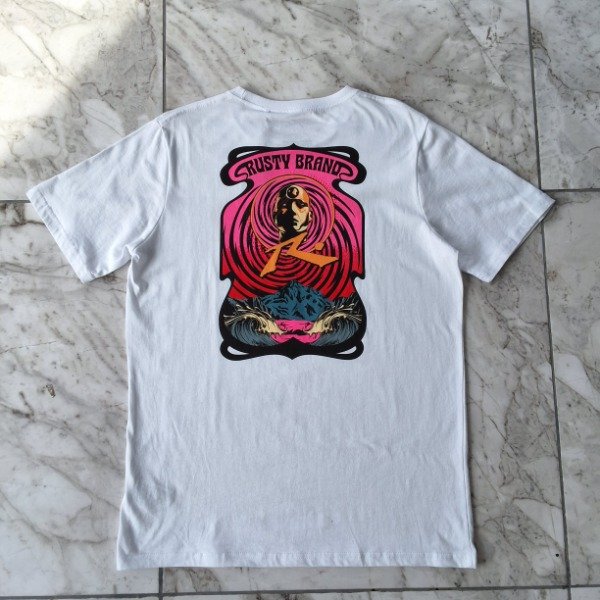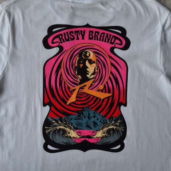 El frente lleva un logo pequeño y discreto con el rostro hipnótico en espiral. La espalda, sin embargo, es la protagonista: un gran estampado psicodélico en tonos vibrantes de rosa, naranja y negro, que enmarca el texto "RUSTY BRAND" y un gráfico de olas/montañas. ¡Ideal para darle un toque atrevido a tu look!